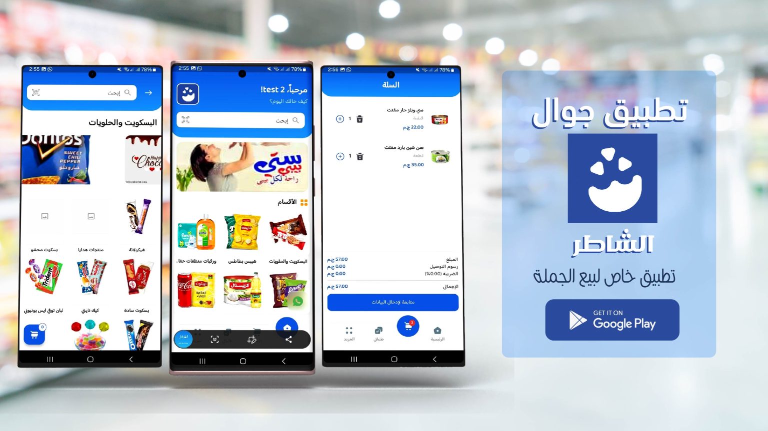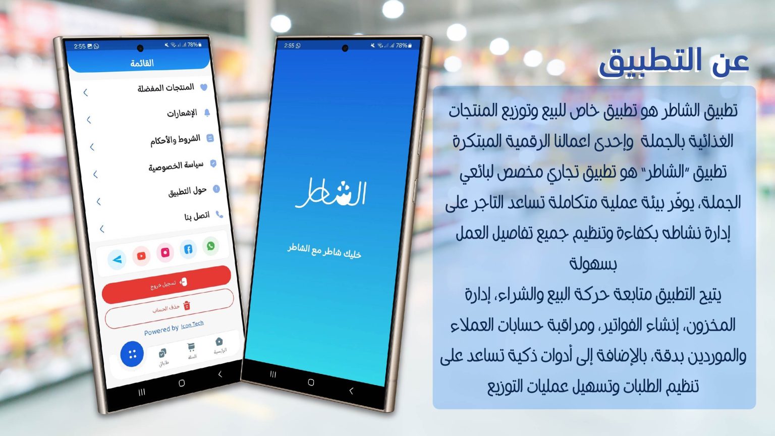 تطبيق “الشاطر” هو تطبيق تجاري مخصص لبائعي الجملة، يوفّر بيئة عملية متكاملة تساعد التاجر على إدارة نشاطه بكفاءة وتنظيم جميع تفاصيل العمل بسهولة